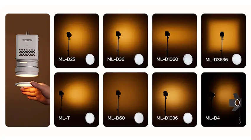 Both models are fully compatible with the Godox Mount ecosystem, supporting a variety of accessories that magnetically attach to the ML-Z reflector, including stackable diffusers and layered diffusion panels.