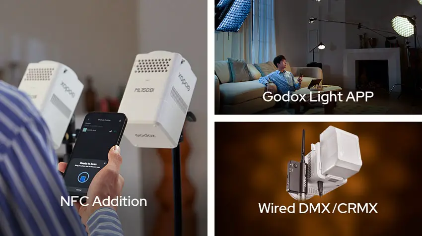 The fixtures support wireless NFC-based connectivity for quick pairing and control through the Godox Light app.
