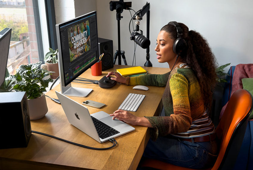 Apple’s studio-quality microphones have been tuned for quieter operation and higher clarity, making the MacBook Pro an all-in-one production hub for content creators and video editors alike.